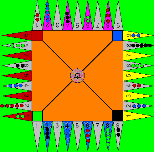 | Das Spielbrett: Das Spielbrett besteht aus vier Spielbereichen, durch Linien getrennt, auf denen sich insgesamt 36 Zungen befinden. Die Aufstellung ist in der Abbildung zu sehen. Die Zugrichtung ist für alle Spieler im Uhrzeigersinn (oder in beiden Richtungen). Das Start-Viertel befindet sich links vom Spieler, das dem Spieler zugewandte Viertel ist das Rausspielfeld (Schluss-Viertel). Die Anordnung der Spielsteine ist so gestaltet, dass sie immer sieben Felder von einander entfernt sind, die Anzahl ist jeweils 2, 3, 2, 3, 5. | ![]() |
