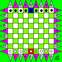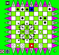 | Spielmaterial: | 9 x 9 Spielbrett, pro Spieler 9 Steine , ein Satz Miwin’scher Würfel |