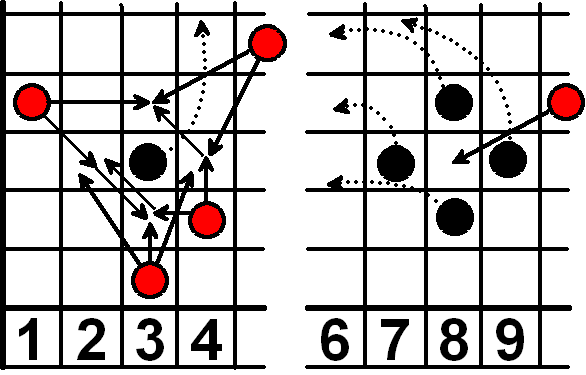 In obigerer Abbildung kann der weiße Stein auf dem Feld [4,4] (1. Zahl = Reihe, 2. Zahl = Spalte ) nur dann ziehen, wenn der Würfel mit der 4 gekippt wird, so das diese Spalte frei wird, und zwar auf die eingezeichneten 24 Positionen. er kann dabei den schwarzen Stein auf Feld [7,3] versetzen. Der weiße Stein auf Feld [3,8] kann nicht ziehen, da die Spalte 8 vom Gegner gesperrt ist. Der weiße Stein auf dem Feld [4,7] könnte, wenn der Spieler den Würfel mit der 7 kippt, die schwarzen Steine auf dem Feld [6,8] und auf dem Feld [7,7] versetzen, nicht jedoch den auf Feld [7,8].