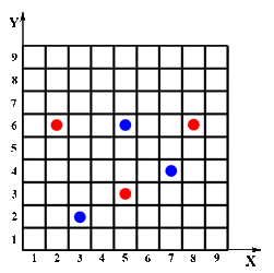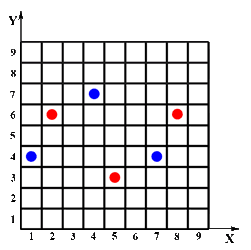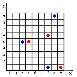 Er setzt somit alle drei Steine in den x-Reihen (x = gewürfelte Zahl) oder den y-Reihen auf ein beliebiges Feld (0 < x < 10, 0 < y < 10).