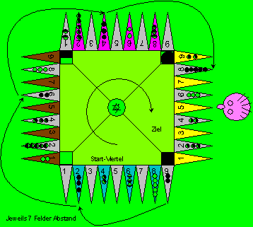 | Das Spielbrett: Das Spielbrett besteht aus vier Spielbereichen, durch Linien getrennt, auf denen sich insgesamt 36 Zungen befinden. Die Aufstellung ist in der Abbildung zu sehen. Die Zugrichtung ist für alle Spieler im Uhrzeigersinn (oder in beiden Richtungen). Das Start-Viertel befindet sich links vom Spieler, das dem Spieler zugewandte Viertel ist das Rausspielfeld (Schluss-Viertel). Die Anordnung der Spielsteine ist so gestaltet, dass sie immer sieben Felder von einander entfernt sind, die Anzahl ist jeweils 2, 3, 2, 3, 5. | ![]() |
