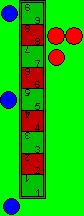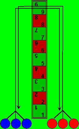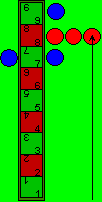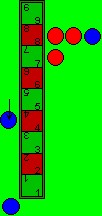 | Begonnen wird mit dem Erst-Wurf, dh. jeder der beiden Spieler würfelt mit allen drei Miwin’schen Würfeln und setzt seine Steine an die entsprechenden Felder, er muss nicht alle drei Steine ins Spiel bringen, er braucht auch nur einen Stein zu spielen oder kann sogar auf alle Steine verzichten. Angenommen blau beginnt und würfelt 9, 5 und 2. Er setzt einen Stein an die linke Seite des Feldes 9, einen Stein an das Feld 5 und die 2 läßt er verfallen. Nun würfelt rot 8, 8 und 7 und setzt alle drei Steine an. Die Stellung nach dem Erst-Wurf ist in rechter Abbildung zu sehen. Beim Erst-Wurf kann jede Augenzahl genutzt werden (Untenfolgende Pasch-Regel wirkt hier nicht). Nachdem ist der Beginnende wieder am Spiel, also in unserem Fall blau und würfelt erneut mit allen drei Würfeln und es beginnt das eigentliche Spiel. | ![]() |