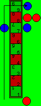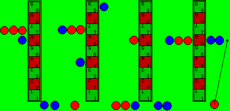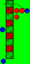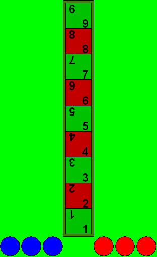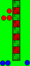 | Damit existiert die rote Mauer nicht mehr, als nächstes folgen die beiden Züge von Feld 8 zu Feld 9 auf der rechten Seite, ferner wird mit beiden auf die linke Seite von Feld 9 gewechselt. Das sind insgesamt fünf Züge, wenn rot bei jedem Zug den Würfel mit der 3 nochmals gewürfelt hätte, mit der Hoffnung, eine 8 zu würfeln, würde 7, 8 und 9 liegen und die anschließende Zugfolge könnte zu folgender Stellung führen (nächstes Bild): | ![]() |
