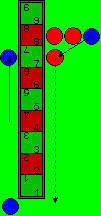 2 1. 8 2 1 : Rot setzt den nicht im Spiel befindlichen Stein auf die rechte Seite der 8, auf der schon zwei rote Steine liegen. Diese drei Steine einer Farbe bilden eine Mauer, der blaue Stein auf 9 kann nicht auf das Feld 8 ziehen, da maximal nur drei Steine nebeneinander liegen dürfen. Der blaue Stein auf der rechten Seite (Feld 7) kann auch nicht rückwärts auf 8 ziehen, jedoch kann der auf der linken Seite ein Feld vorwärts ziehen. Rot ist nochmals dran, würfelt einen Zweier-Pasch und eine 9 (2 2 9), verzichtet auf den Zug, da er rückwärts springen müsste, somit ist blau an der Reihe. |