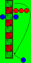 | 9 8 4 : Wechselt mit dem Stein von der linken Seite des Feldes 9 auf die rechte Seite, von hier darf er nicht zurück. Da die 8 auch noch liegt, kann er diese auch noch nutzen und zieht zum Feld 8. Hier befinden sich bereits zwei schwarze Steine doch darf die Figur sich außen anlegen. Es dürfen nie mehr als drei Steine an einem Feld liegen, daraus folgt, daß kein anderer Stein an dieser Gruppe (Mauer) vorbeiziehen kann, sie versperren den Weg. Außerdem sind die beiden roten Steine durch den blauen gefangen, solange sie sich zwischen Spielbrett und dem blauen Stein befinden, sie können erst wieder ziehen, wenn der blaue Stein dieses Feld verläßt oder von der gegenüberliegenden Seite geschlagen wird (siehe unten). Da blau seine Figuren bewegt hat, kommt er nochmals dran. Er läßt die 4 liegen, um notfalls noch einen Zug machen zu können und würfelt nur mit dem blauen und dem roten Würfel (1 und 5). | ![]() |