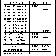 | Chance | Summe der drei Augen | Summe der drei Augen + 100 | Angesagt 17: Wurf: [6,3,8]: 3 + 6 + 8 + 100 = 117 |