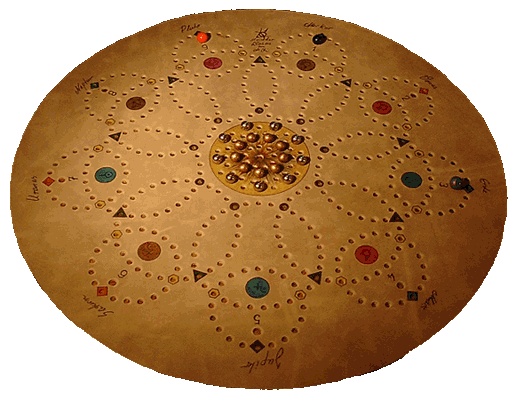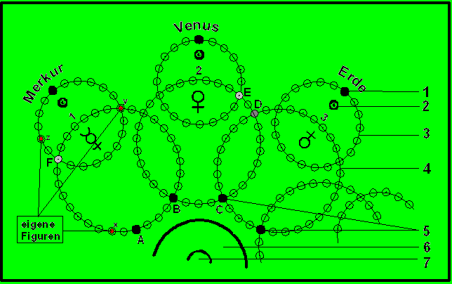 Startfeld, außen herum das Planetensystem, bestehend aus den neun Planten
