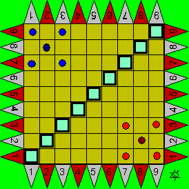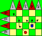 Jedes Spielfeld ist durch zwei Zahlen charakterisiert, nämlich der Nummer der Reihe und der Nummer Spalte (1. Zahl = Reihe, 2. Zahl = Spalte ), das heißt, Sie haben zwei Zahlen zur Wahl, um auf ein Feld zu kommen. In nebenstehender Abbildung steht der blaue Ritter auf dem Feld [7,4] und könnte bei einem Wurf mit 8 auf die drei Felder der Reihe 8 ziehen ( [8,3], [8,4], [8,5] ). Die gleichen Felder kann er auch betreten, wenn 3, 4 oder 5 gewürfelt wäre. Häufig kommt es vor, dass Sie mit einigen Steinen mehrmals ziehen können - der rote Ritter kann bei einem Wurf von 2, 8 und 9 den gezeichneten Weg ziehen. Es hätte aber auch ein Wurf wie 7,2,1 oder 2,2,1 zum gleichen Ziel geführt. Bei einem Pasch-Wurf (zwei gleiche Augenzahlen) kann ein beliebiger Stein auf das entsprechende Pasch-Feld springen, das sind die dick umrandeten Felder auf der Diagonalen (zB: 6er Pasch => ein Ritter kann auf das Feld [6,6] springen), - egal wo er sich befindet, befindet sich dort bereits ein Stein, so kann dieser Zug nicht ausgeführt werden und der andere Spieler ist dran. |